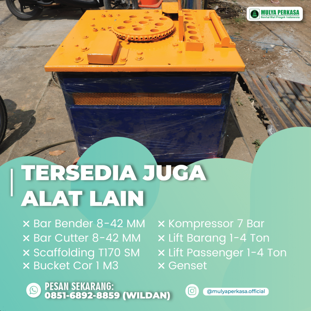 Dengan memilih Sewa Bar Bender Tasikmalaya, kontraktor tidak perlu mengeluarkan biaya besar untuk membeli unit baru. Cukup menyewa dari penyedia terpercaya yang menawarkan harga kompetitif serta unit yang terawat.